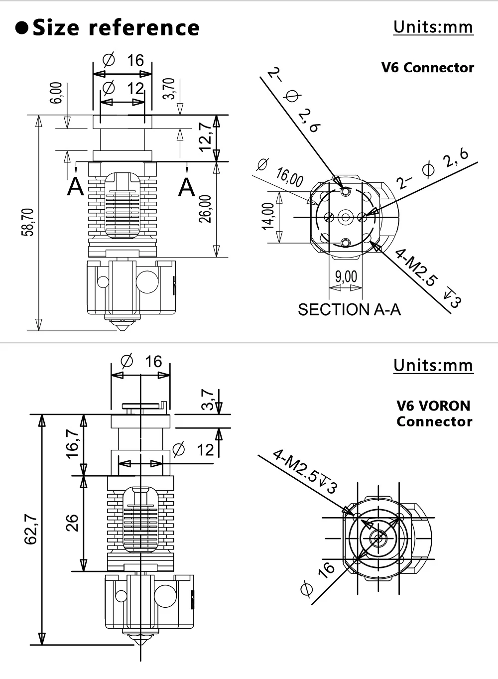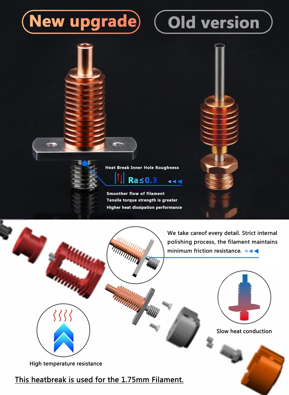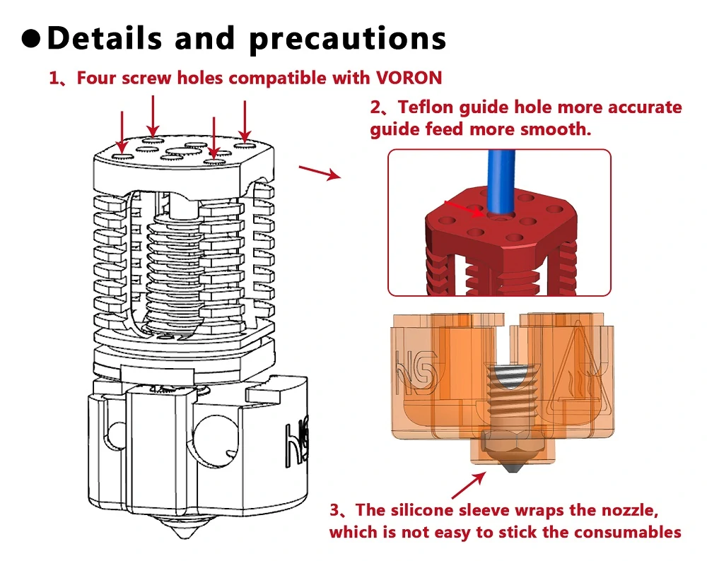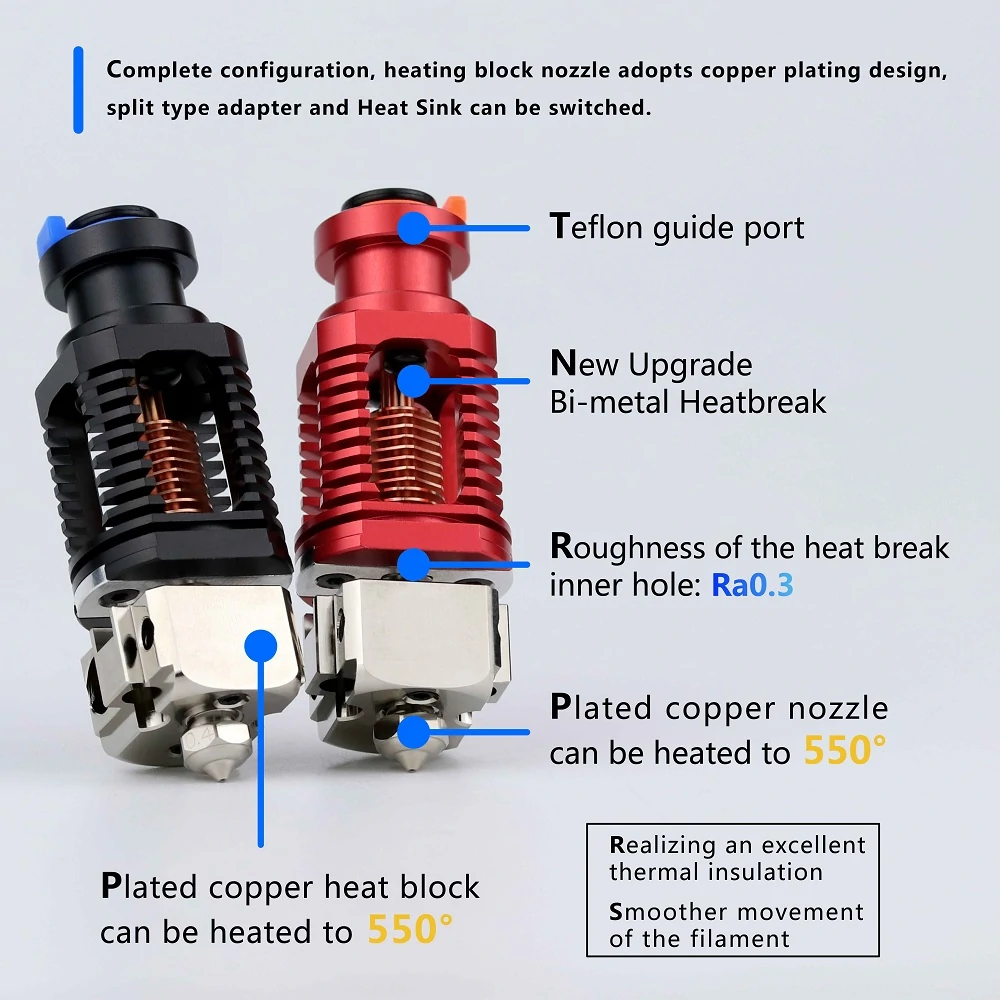 BI-METAL HEATBREAK:High quality titanium alloy + plated copper,real bimetal material Copper and Titanium TC4. Titanium TC4 reduces heat upward conduction at the heating position, and copper for heat dissipation to accelerate heat conduction.