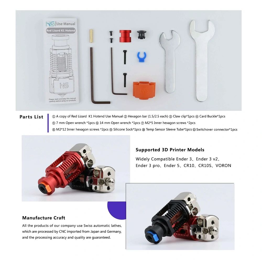 Red Lizard K1 V6 Hotend Assembled Hotend Plated Copper Nozzle for Ende3 V2 Extruder Voron Prusa I3 MK3 Extruder 3D Printer Parts - Aluminum-red