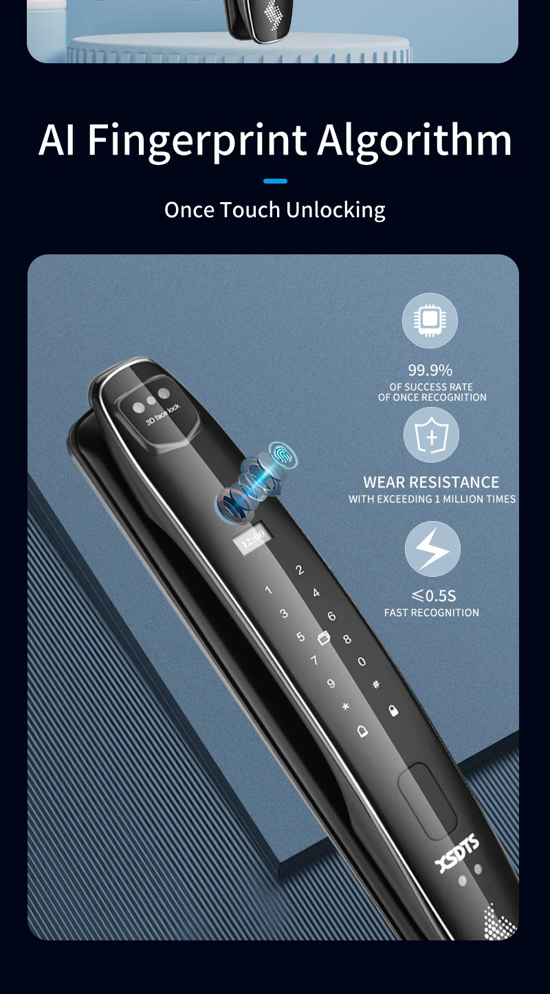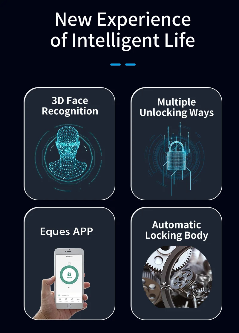 1. 6 unlock ways: 3D infraed Face,Fingerprint, Password, IC Card, Mechanical Key ,APP