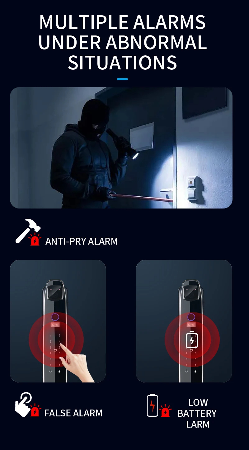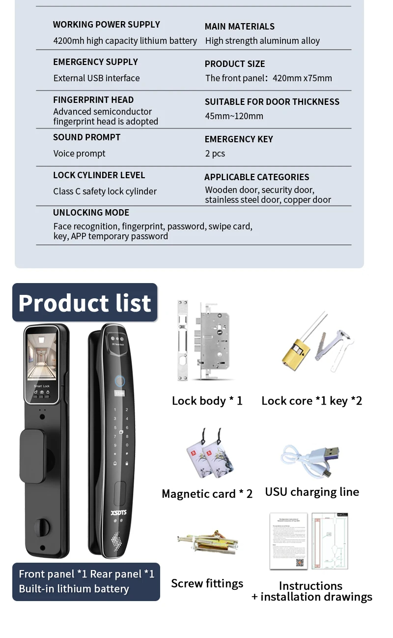 Unlocking Mode: Face recognition, fingerprint, password, swipe card, key, APP temporary password