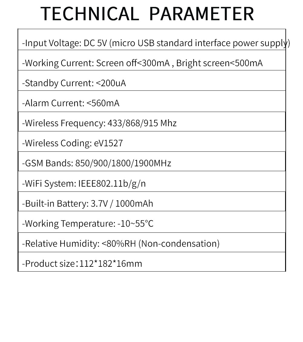 | Working Current | Screen off<300mA , Bright screen<500mA |