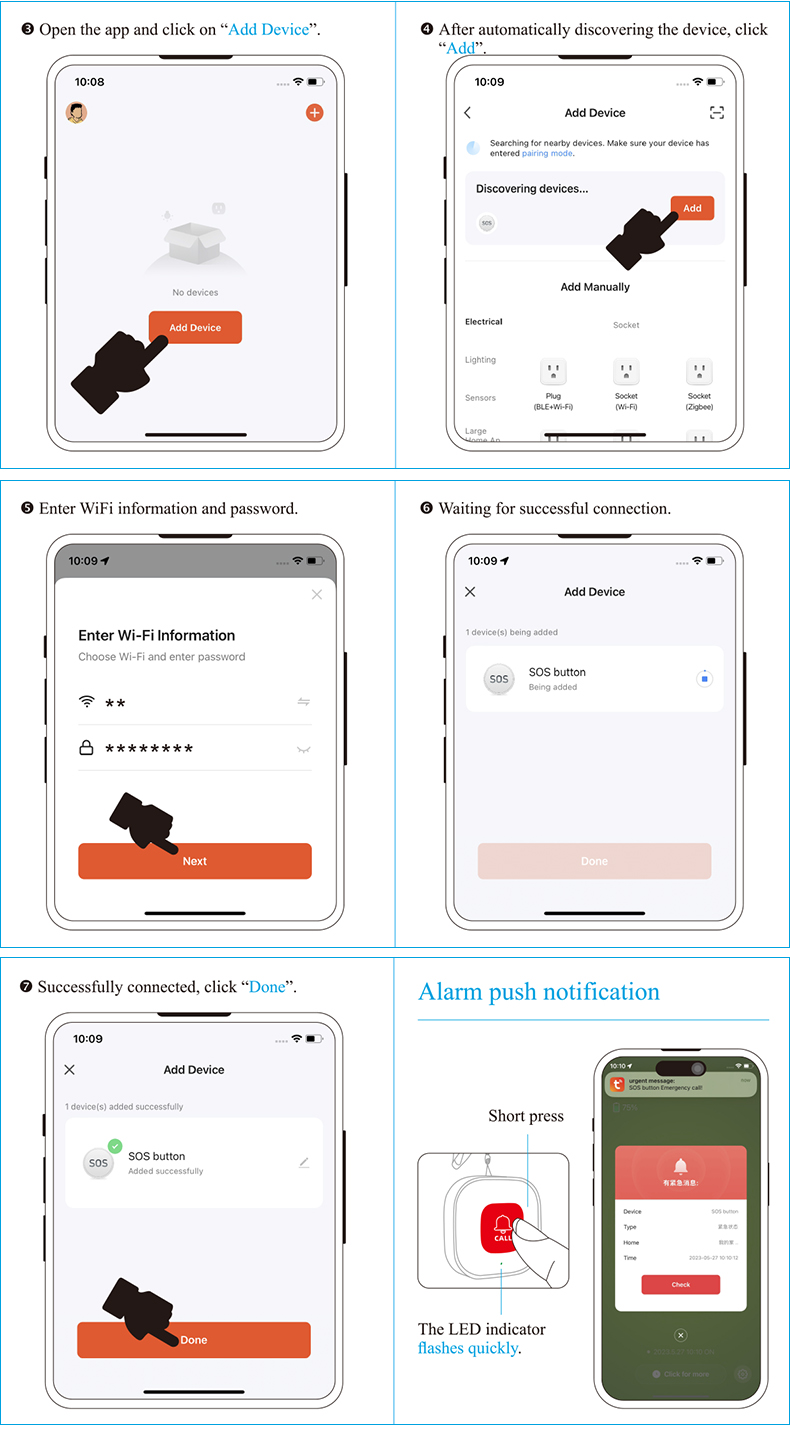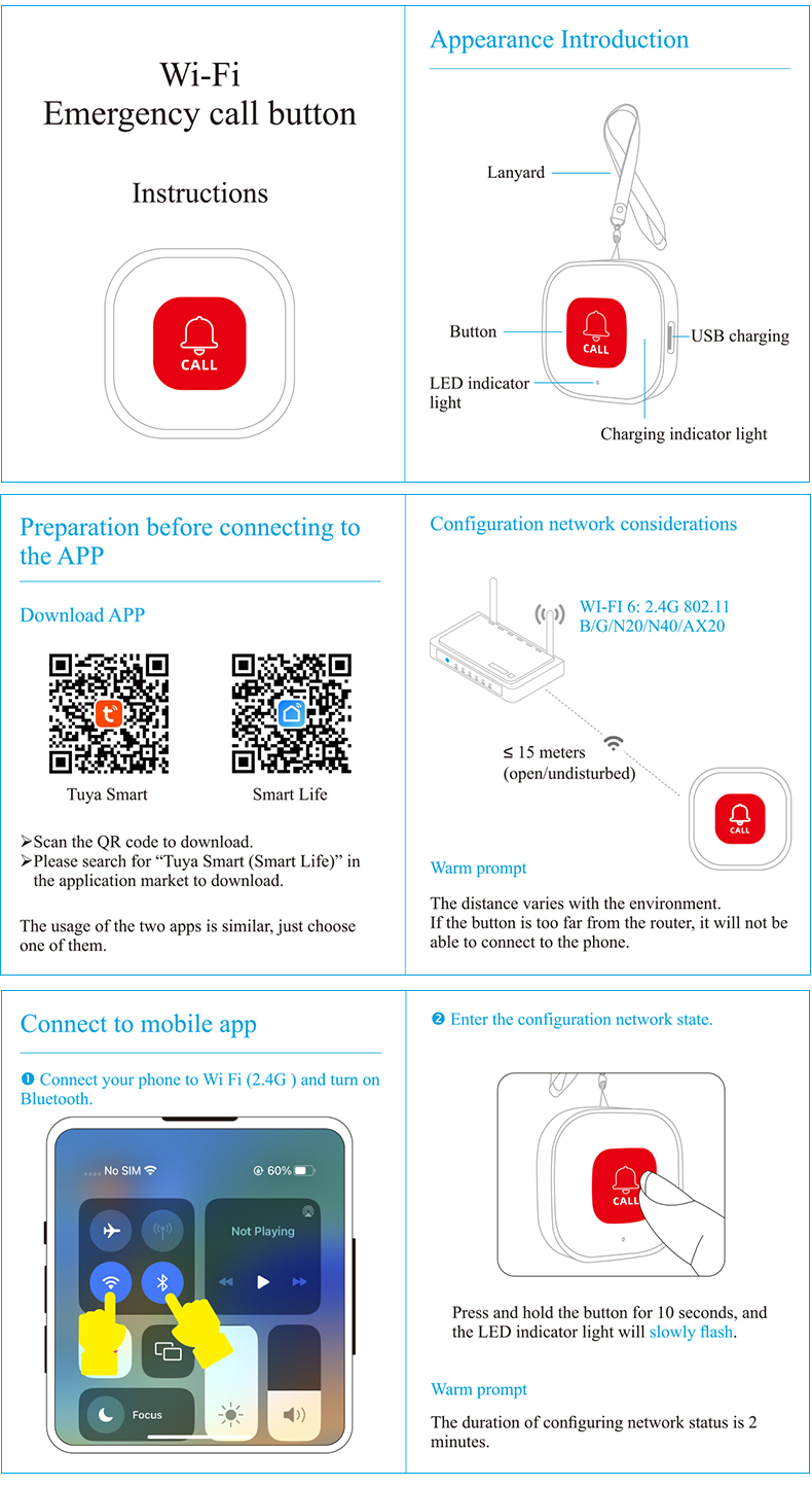 Smart App Integration: The device seamlessly integrates with the Smart Life and Tuya Smart apps, enabling users to set up and manage the emergency button remotely. This ensures that family members or caregivers can receive notifications and respond promptly to distress signals.