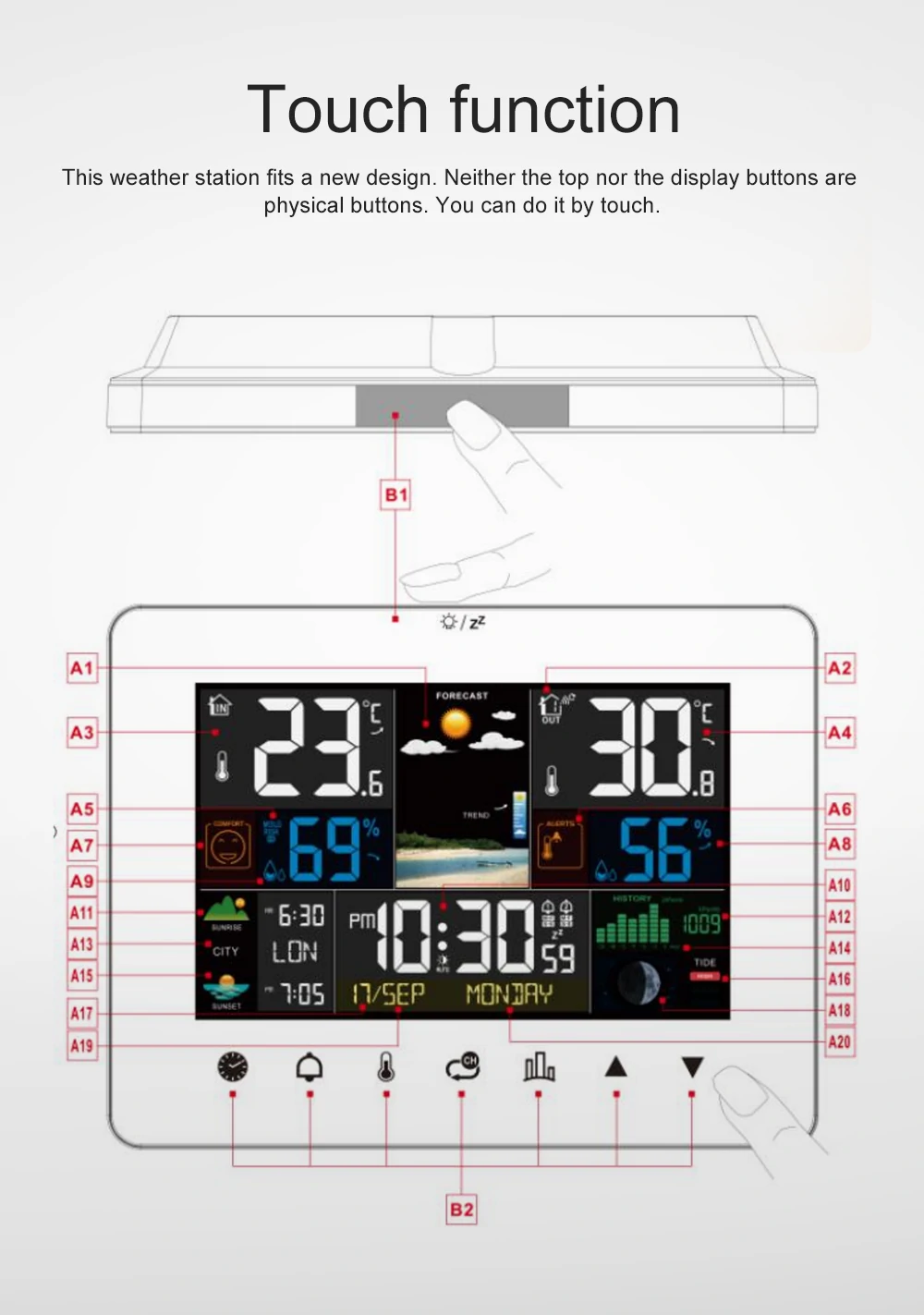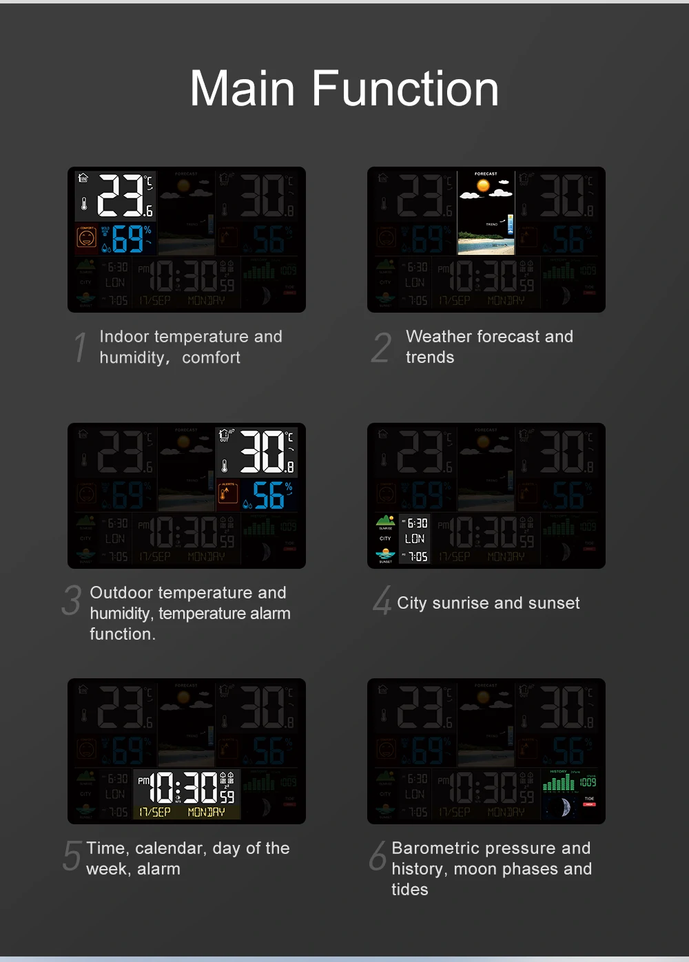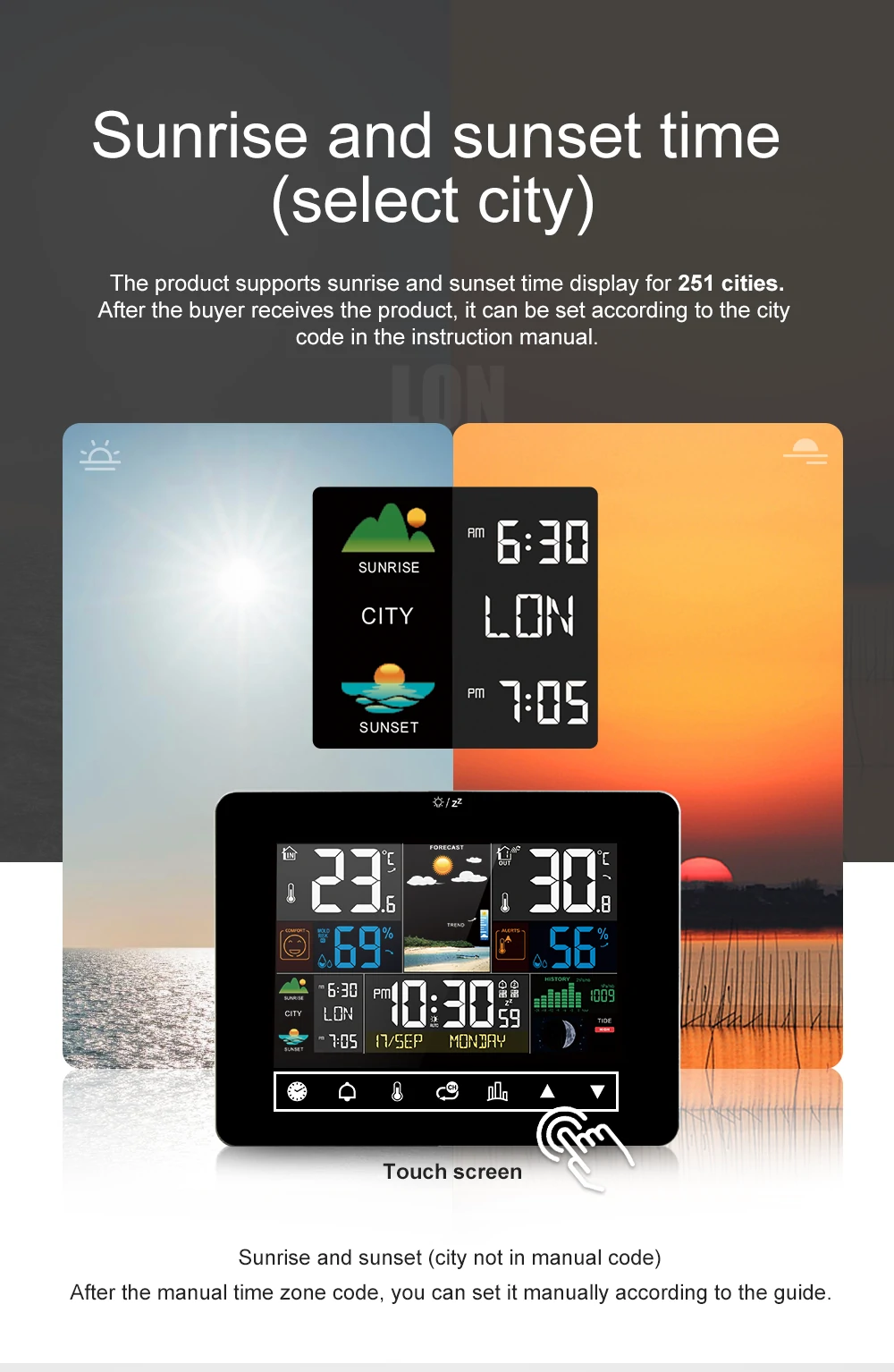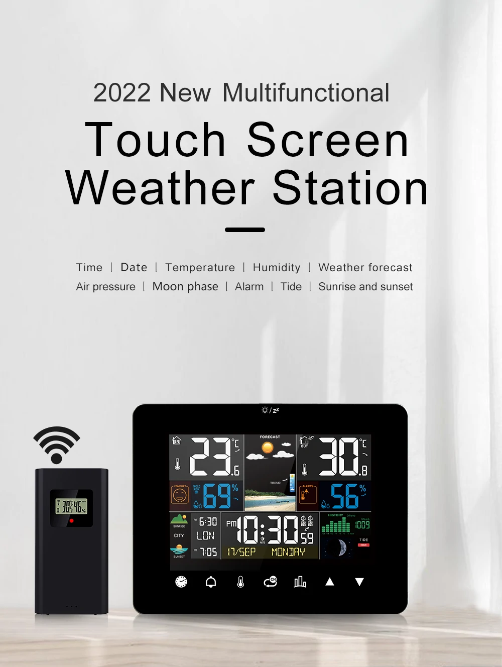 2022 Newest FanJu Weather Station Touch Screen Wireless Indoor Outdoor Thermometer Table Clock with Sunrise and Sunset Time Moon Phases and Tides and Mold Risk