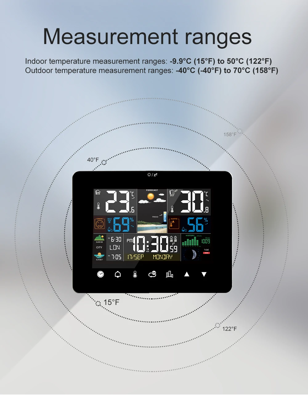 ► Temperature: — Indoor temperature measurement ranges: -9.9°C (15°F) to 50°C (122°F) — Outdoor temperature measurement ranges: -40°C (-40°F) to70°C (158°F) — Temperature alternatively in °C or °F. — Outdoor thermometer alert. ► Minimum/maximum display for air humidity and temperature
