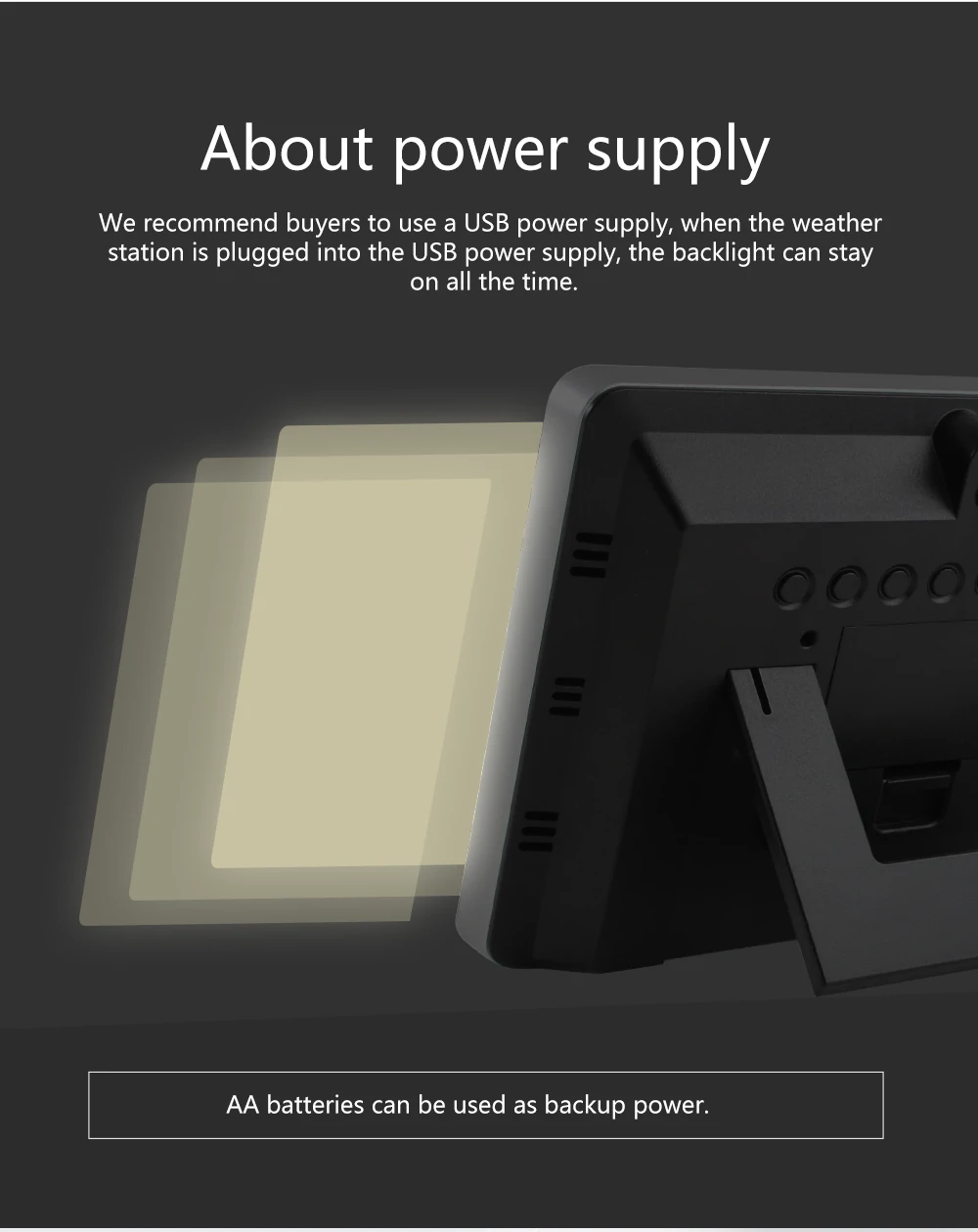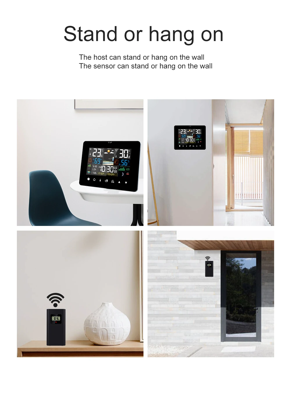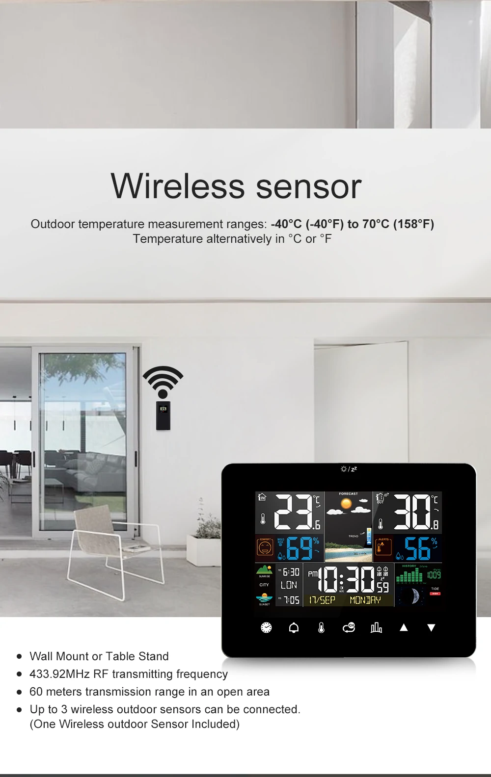 ► Wireless Outdoor Sensor: — Wall Mount or Table Stand — 433.92MHz RF transmitting frequency — 60 meters transmission range in an open area —Up to 3 wireless outdoor sensors can be connected. (One Wireless outdoor Sensor Included)