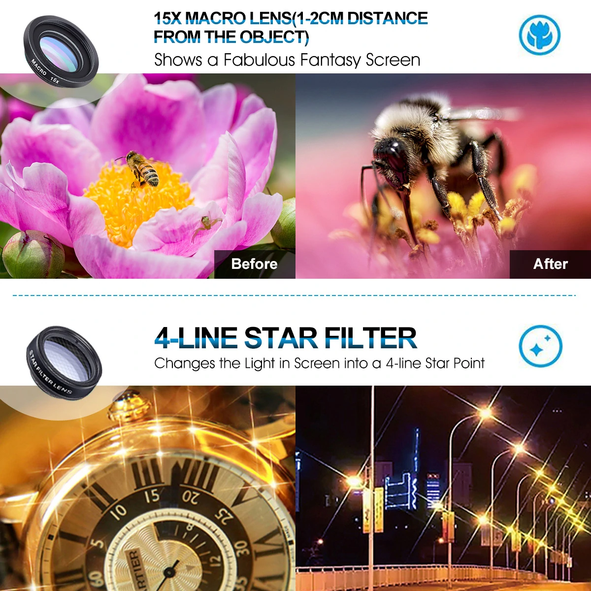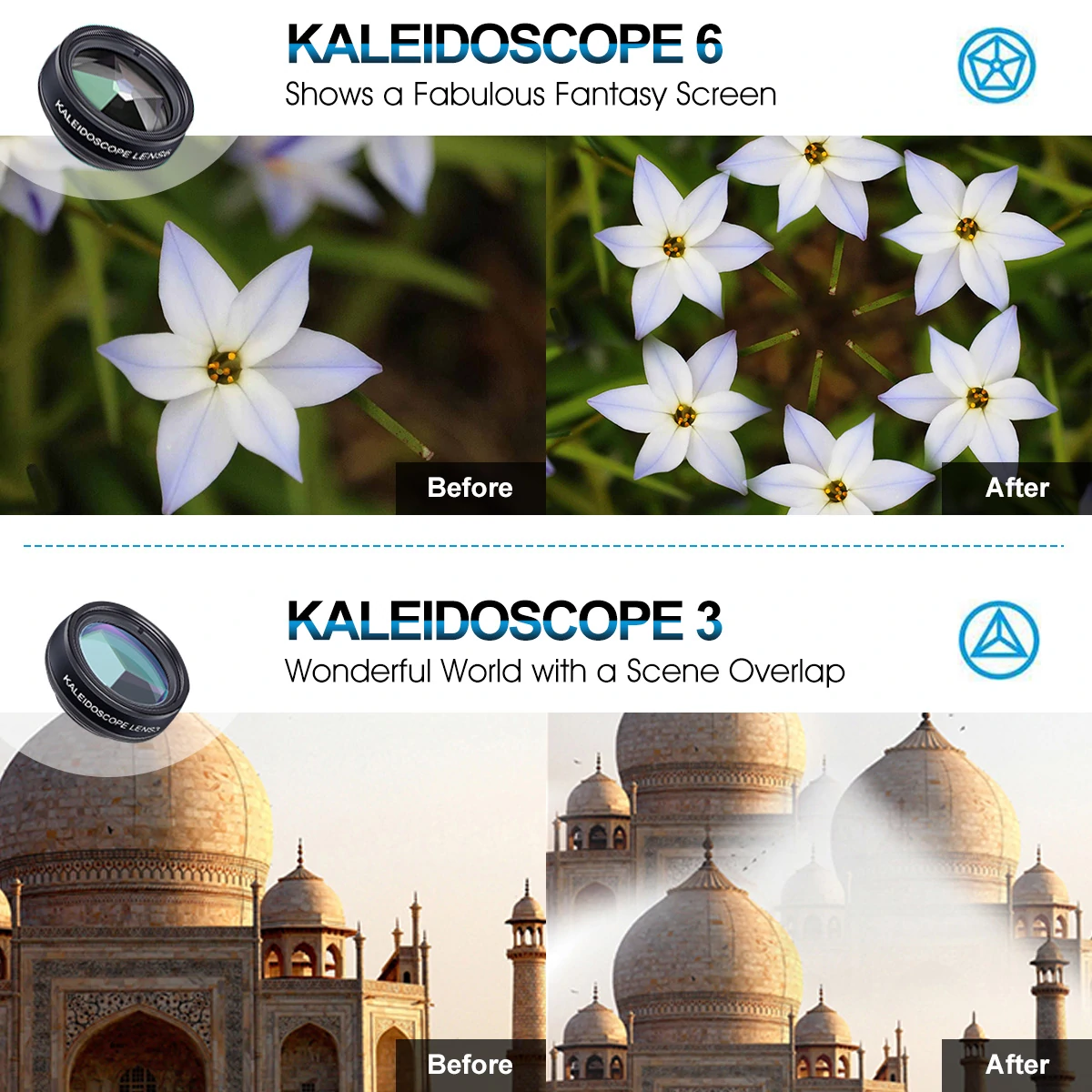 Hizek 10 in 1 Phone Lens Kit Macro Lens Wide Angle Lens Fisheye Lens Telephoto Lens CPL Flow Radial Star Filter Kaleidoscope 3/6 Lens For Smartphones