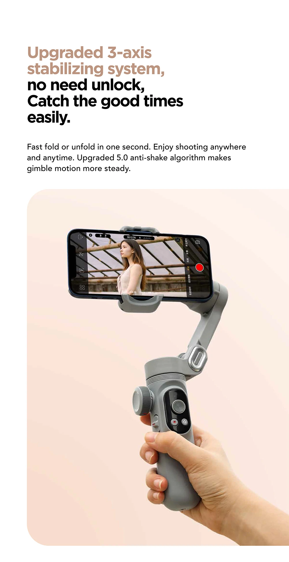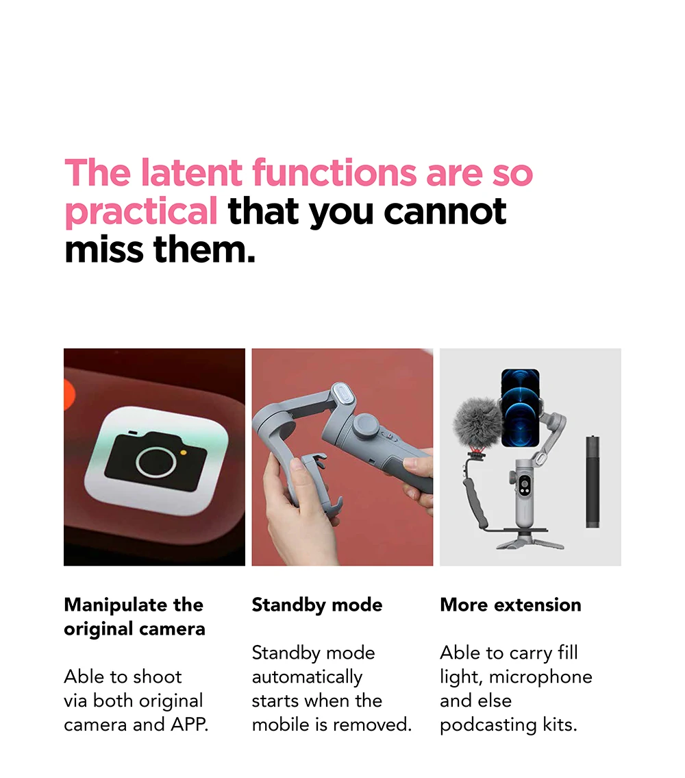 Features: Upgraded 3-axis Stabilizing System& Three-sectionsoft Fill Light: Fast fold or unfold in one second. Enjoy shooting anywhere and any time. Upgraded 5.0 anti-shake algorithm make gimble moves more steady. The built-in ring light in the mobile clip is nimbal and nice.