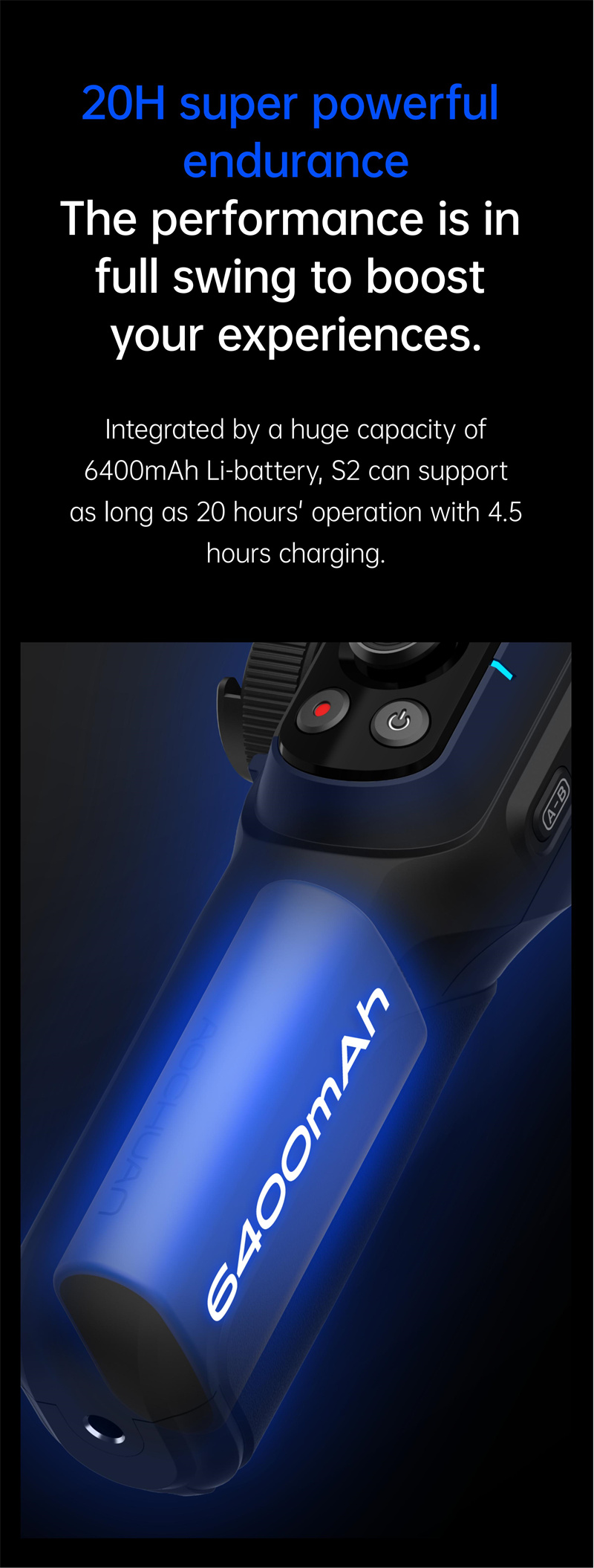 5. Long Battery Life: With a substantial 6400mAh battery capacity, the gimbal offers an impressive standby time of approximately 20 hours, ensuring you have ample time for extended shooting sessions. Additionally, it takes only about 4.5 hours to fully charge the gimbal.