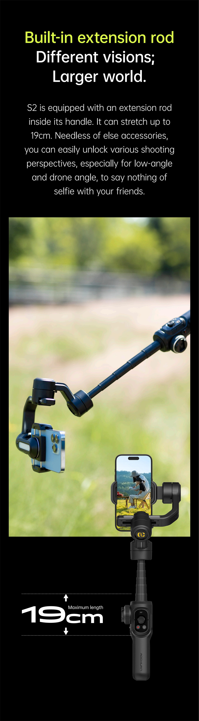 4. Extendable Rod: The included extendable rod enhances your shooting flexibility, allowing you to capture shots from various heights and angles. It's perfect for group photos, wide landscapes, and unique perspectives.