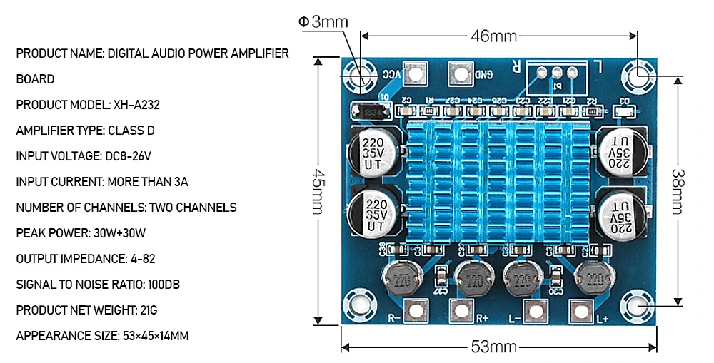 XH-A232 HD Digital Stereo Audio Power Amplifier Board 30W+30W 2.0 Channel MP3 Amplifier Module DC 8-26V 3A