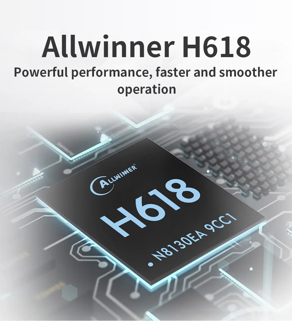 Processor: Allwinner H618 64-bit Cortex-A53 Quad-core CPU, 1.5GHz