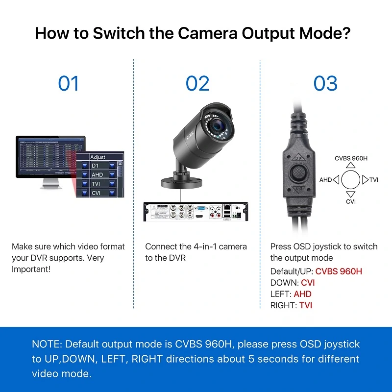 This 1080P full HD camera has a built-in OSD menu that can change the 4 different video outputs: HD-TVI, AHD, CVI, and CVBS(960H), and adjust the video settings.
