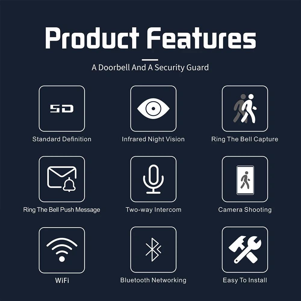 1.Smart Housekeeping video doorbell 24 hours security guard press the doorbell to capture the image, two-way intercom visitors, infrared night vision.